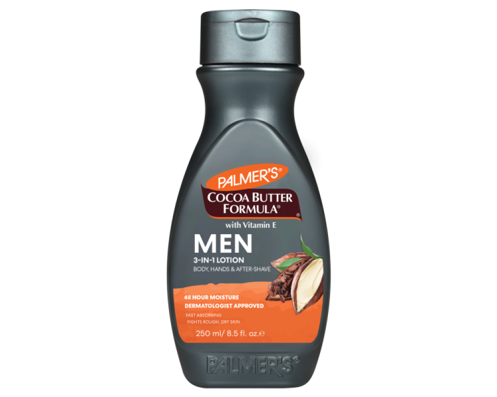 Palmer's мъжки лосион за лице, ръце и тяло е бърза абсорбираща формула, която моментално омекотява и подхраннва грубата и суха кожа. Формула с чисто какаово масло обогатено с витамин Е е създадена за ежедневна грижа за лице, тяло, ръце и след бръснене. След нанасяне кожата е добре хидратирана, без да има мазно усещане. Лосионът има неповторим свеж мъжки аромат и 48 часова хидратация и е подходящ за кожа склонна към екзема.