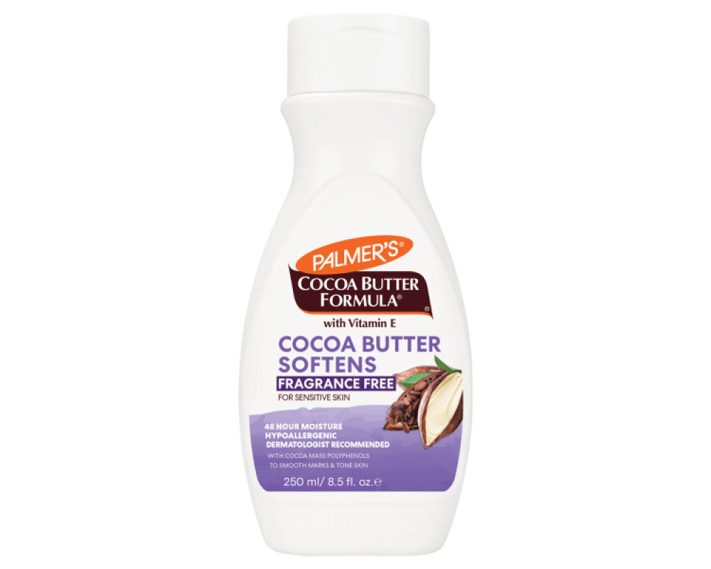 Лосион за тяло с какаово масло от Palmer's е създаден на базата на чисто какаово масло обогатено с витамин Е, подходящ за ежедневна употреба при суха и дехидратирана кожа. Най-новата подобрена интензивна формула без аромат за 48 часова хидратация, подхранва и овлажнява дори най-сухата и груба кожа. Висококонцентриран плътен лосион разтапящ се мигновенно, проникващ и попиващ в дълбочина. Подходящ за изглаждане на несъвършенствата върху кожата предизвикани от стрии, белези, изглажда релефа на кожата. Придава мекота и гладкост веднага след нанасяне. Специално формулиран за чувствителна кожа, без аромат, хипоалергенен, подходящ за кожа склонна към екзема.